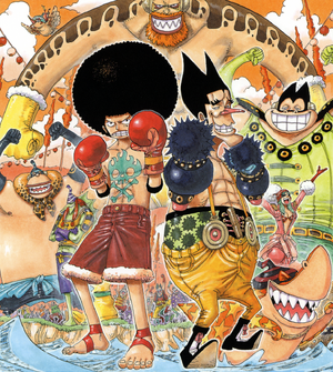 menggambarkan bajak laut Straw Hat yang kembali menghadapi Foxy, Porche,